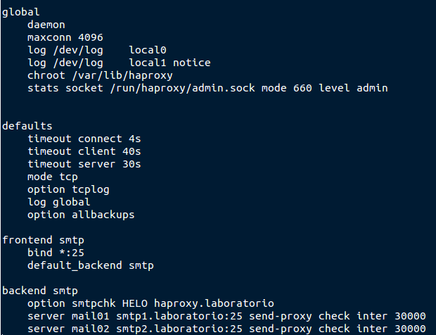 Destacando as diretivas Frontend e Backend, que, respectivamente, correspondem ao serviço e porta que será iniciada no servidor Haproxy e os servidores SMTP que farão parte do pool. Como a porta utilizada no proxy também será a padrão SMTP [25], é necessário desinstalar outros servidores SMTP que por ventura tenham sido instalados por padrão pela distribuição.