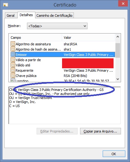 Portanto, para utilização deste certificado, será necessário efetuar o Bundle das cadeias de certificado Verisign e Symantec Class 3 EV SSL CA – G3. Ao clicar em qualquer item do caminho de certificação, no botão “detalhes“, é possível obter mais informações sobre a cadeia que necessita ser utilizada:
