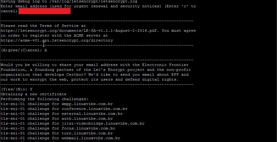 O script irá configurar um servidor WEB temporário para validação e emissão do certificado, sendo necessário concordar com a licença e informar o e-mail para contato: