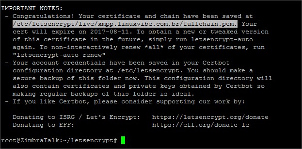 Neste momento, você já pode iniciar o seu serviço novamente (proxy ou mailbox) e iniciar a instalação do certificado assinado. Um desafio com a utilização de certificados da Let’s Encrypt é a renovação do mesmo, que deve ser efetuada a cada 90 dias, que pode ser automizada com o Certbot (https://certbot.eff.org/). O outro desafio é que com a renovação, será gerado um novo certificado, sendo necessário implementar novamente no Zimbra.
