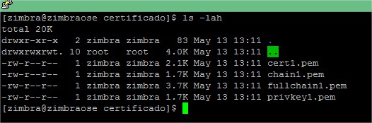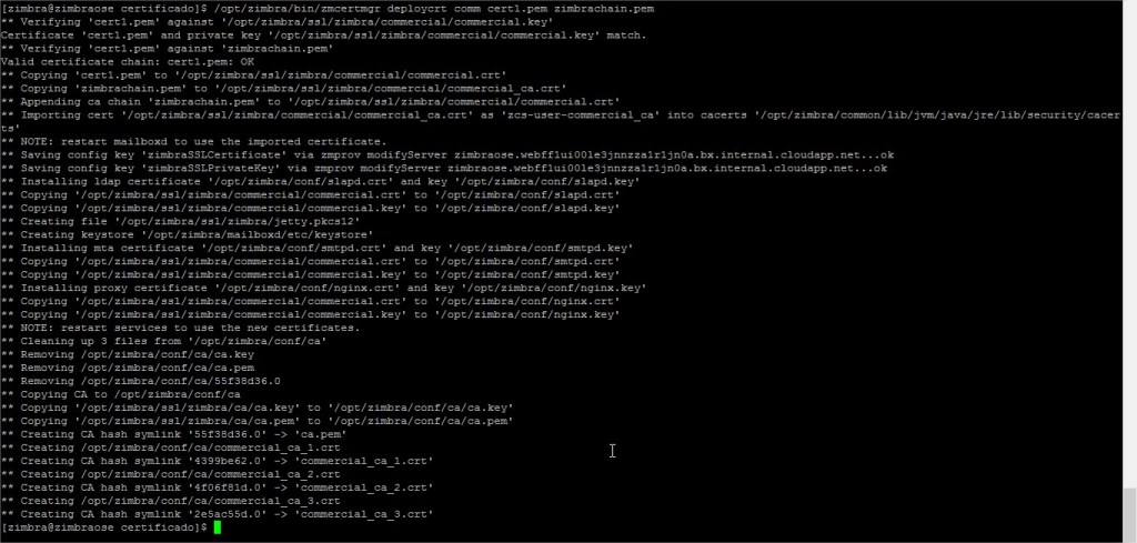 /opt/zimbra/bin/zmcertmgr deploycrt comm cert.pem CHAIN_COMPLETA.pem