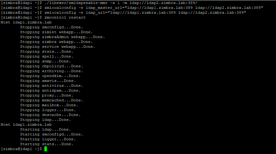 zmlocalconfig -e ldap_master_url="ldap://ldap2.zimbra.lab:389 ldap://ldap1.zimbra.lab:389" zmcontrol restart