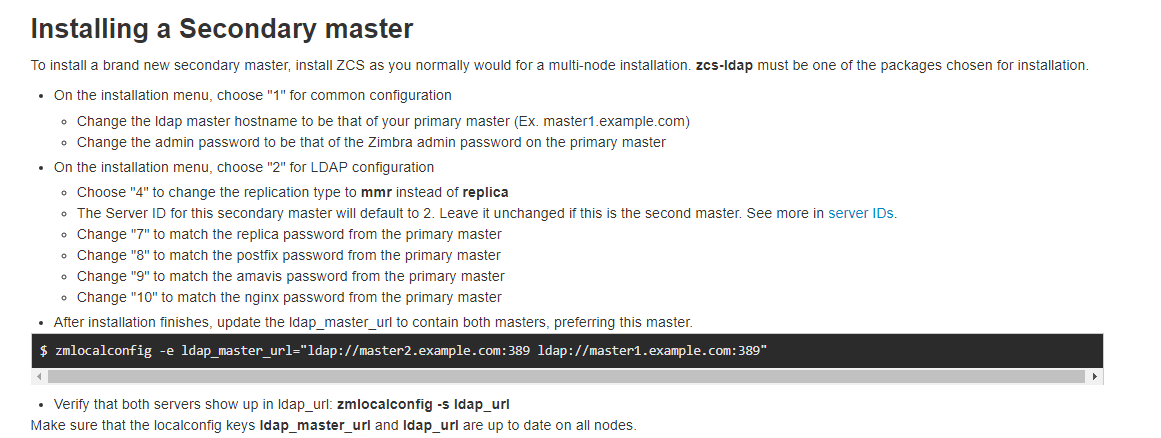 ./libexec/zmldapenable-mmr -s 1 -m ldap://ldap2.zimbra.lab:389/ zmlocalconfig -e ldap_master_url="ldap://ldap1.zimbra.lab:389 ldap://ldap2.zimbra.lab:389" zmlocalconfig -e ldap_url="ldap://ldap1.zimbra.lab:389 ldap://ldap2.zimbra.lab:389"