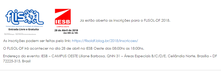 Olá! É com muito prazer que compartilho com vocês que irei palestrar sobre Zimbra no FLISOL DF 2018. Irei falar sobre E-mail, colaboração e produtividade com software Livre, utilizando a plataforma Zimbra Collaboration.