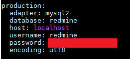 Em production, vamos alterar os campos database, host, username e password pela base de dados, host para conexão com o banco de dados, usuário e senha, respectivamente. Nesta instalação, o MariaDB está sendo instalado no mesmo servidor do Redmine, portanto a configuração ficaria da seguinte forma:
