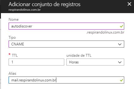 - Apelido (CNAME) autodiscover apontando para o servidor de E-mail (neste caso. mail.respirandolinux.com.br)