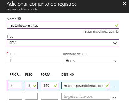 - Entrada do tipo SRV para o servidor de E-mail (neste caso, mail.respirandolinux.com.br), com as seguintes configurações: