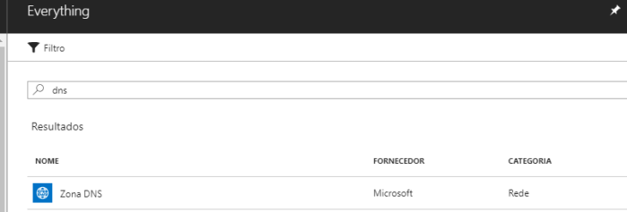 Para criar a Zona DNS, no portal do Azure, clique em “Criar um recurso” e escolha a opção “Zona DNS” (procure por “dns” ou “zona dns” no campo de busca):