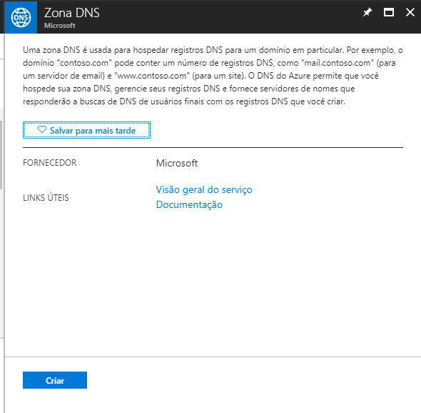 A próxima tela será exibida após selecionar a opção Zona DNS, com uma descrição do serviço. Clique em “Criar“: