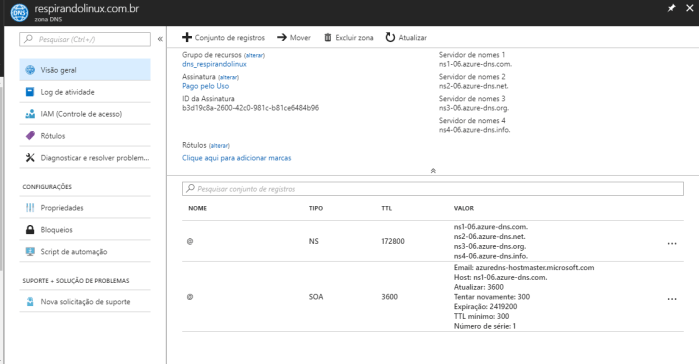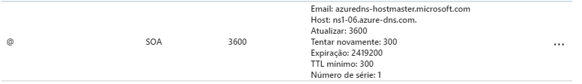Na imagem (importante) abaixo, vemos a configuração padrão da Zona DNS recém criada no Azure: