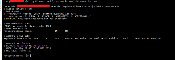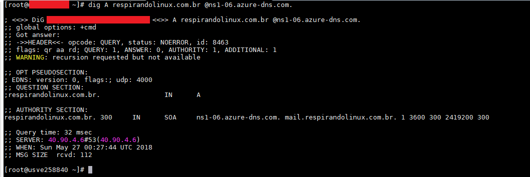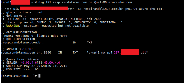 Nas imagens abaixo, vemos as consultas das entradas sendo efetuadas diretamente em um dos servidores DNS que irão gerenciar o domínio (o mesmo foi obtido na imagem destacada como “importante”).