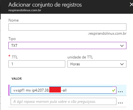 Vamos agora criar um registro do tipo “TXT” para configuração correta do SPF (caso tenha necessidades diferentes, basta consultar sobre o mecanismo SPF), com o seguinte valor: