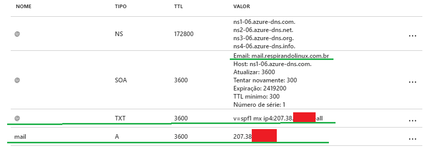 Registros criados para o domínio, já incluindo a entrada TXT para o SPF: