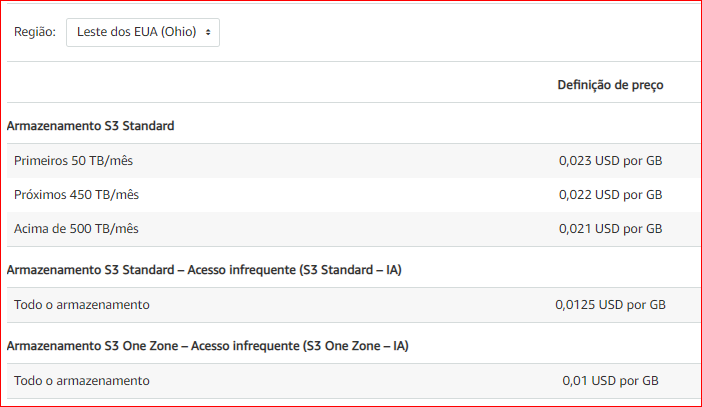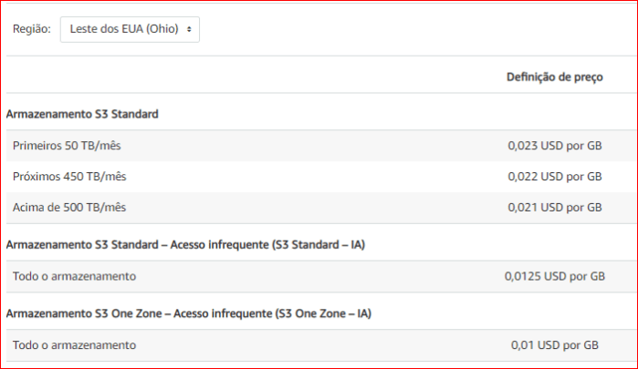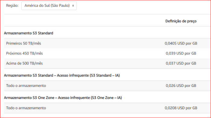 Link para a tabela de preços: https://aws.amazon.com/pt/s3/pricing/