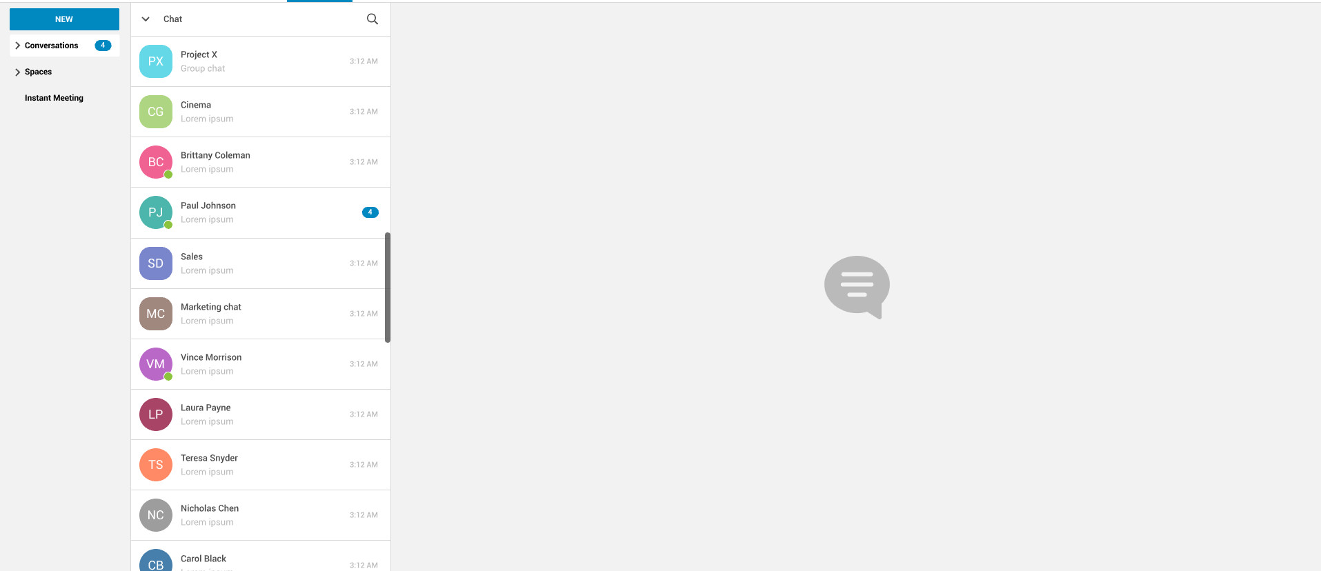 Interface do Zimbra Connect com Espaços, Canais e Grupos: