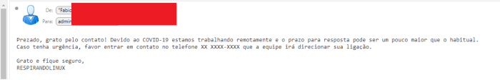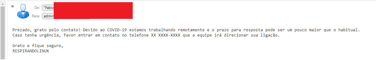 Prezado, grato pelo contato! Devido ao COVID-19 estamos trabalhando remotamente e o prazo para resposta pode ser um pouco maior que o habitual. Caso tenha urgência, favor entrar em contato no telefone XX XXXX-XXXX que a equipe irá direcionar sua ligação. Grato e fique seguro, RESPIRANDOLINUX