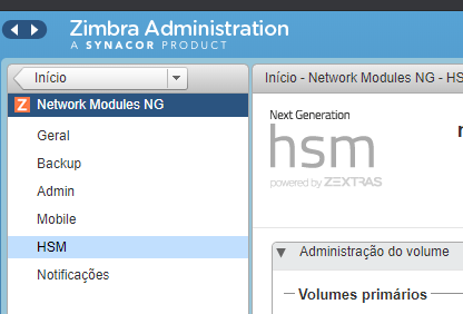 - Após criar o bucket na região desejada, no Zimbra vamos acessar o módulo HSM na interface de administração:
