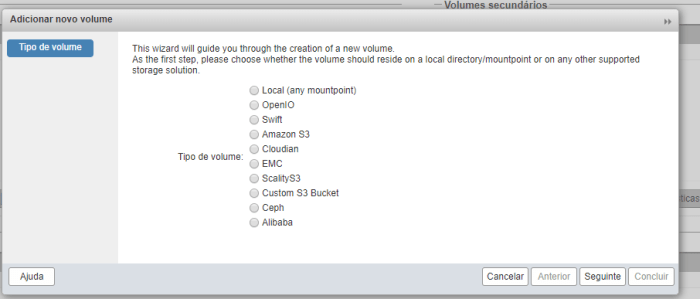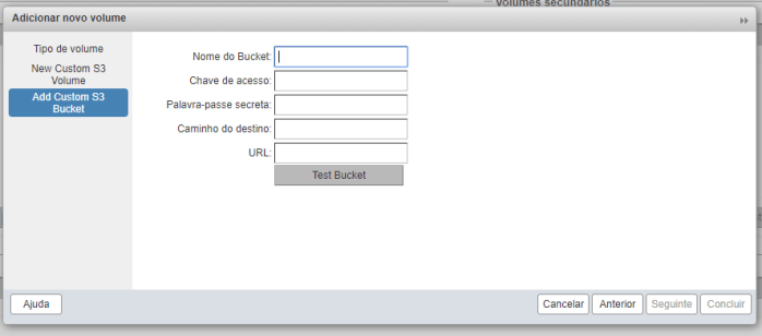 Na interface administrativa, você irá em Volumes Secundários, clicar em Adicionar, onde deve ser escolhida a opção “Custom S3 Bucket”: