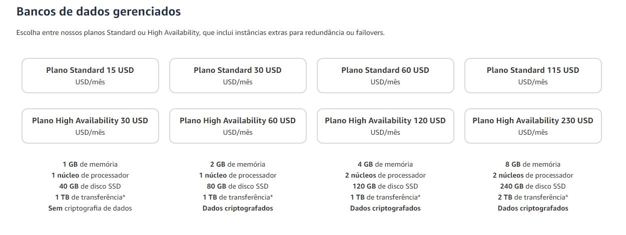 O Lightsail oferece bancos de dados MySQL ou PostgreSQL totalmente configurados, independentemente de servidores virtuais com planos que incluem instâncias extras para redundância ou failover.