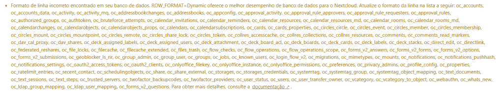 Essa mensagem indica que várias tabelas do seu banco de dados ainda estão usando um formato de linha obsoleto. O Nextcloud recomenda o uso do ROW_FORMAT=DYNAMIC para melhorar a performance, especialmente com colunas longas e índices eficientes em bases InnoDB.